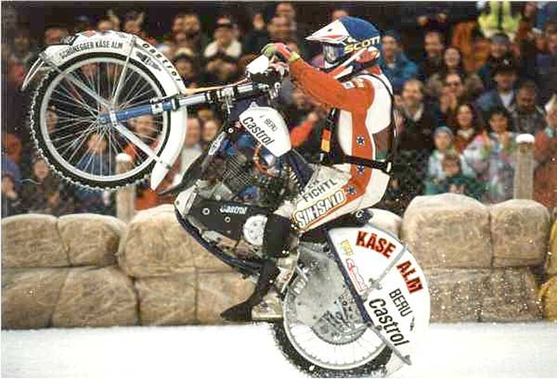 Das Bild zeit unser Clubmitglied Michael Lang in Aktion. Er war in den 90er Jahren bester westlicher Eisspeedway Fahrer und belegte 1993 den 3. Platz bei der WM. Michael ist seit 1978 Clubmitglied und wurde auf Grund seiner Verdienste für den Club 2015 zum Ehrenmitglied ernannt